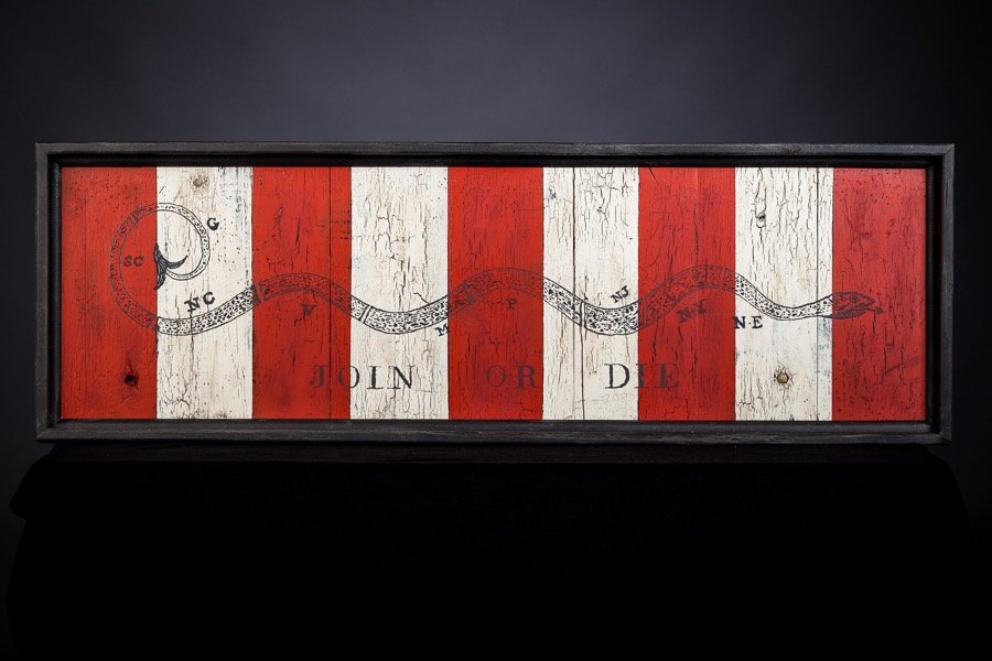 “We were at my brother’s house, and I was sitting across from a tavern sign my sister-in-law had just purchased at Colonial Williamsburg,” Philip says. “As someone who has always loved American history, I decided in that moment to create art inspired by that time period. I went home that night and sketched my first signboard – Ben Franklin’s ‘Join or Die’ political cartoon.”